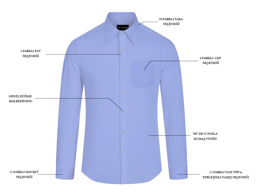 Tailord Gömleği ölçülerinize göre dikkatle elde kesilerek, titizlik ile üretilir. Her bir gömleğin kol takımında dikişte burgulanmayı önleyecek tela kullanılır. Yan dikişler dikiş açması ve burgulanmayı önleyen İngiliz dikiş tekniği kullanılarak düzgün bir görünüm sağlanır. Tüm dikişlerde bir santimetrede yedi vuruş ve non iron kumaşlarda ise beş vuruş uygulanır. Ek olarak, gerçek sedef düğmelerin ascolit tekniği ile sağlamlaştırılması ve geniş monogram opsiyonları, gömleğin zengin bir görünüme sahip olmasına katkı sağlar.
